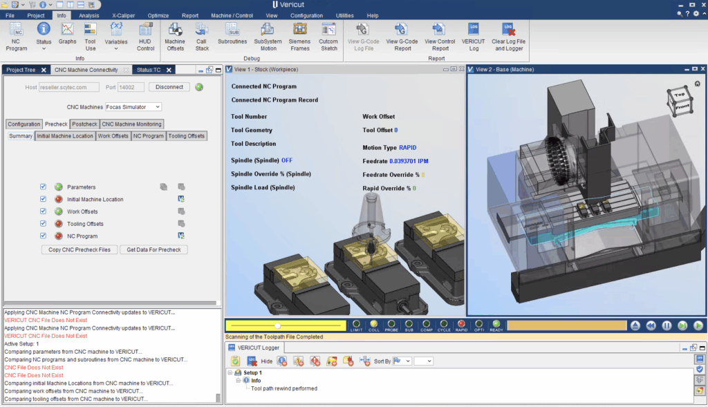 Scytec has partnered with Vericut to integrate the DataXchange machine monitoring system via the CNC Machine Connect module. This allows Vericut to connect directly to CNC machines using real-time shop floor data, enabling highly accurate digital twins and a more efficient manufacturing process. CNC Machine Connect includes Precheck, Live Monitoring, and Postcheck.